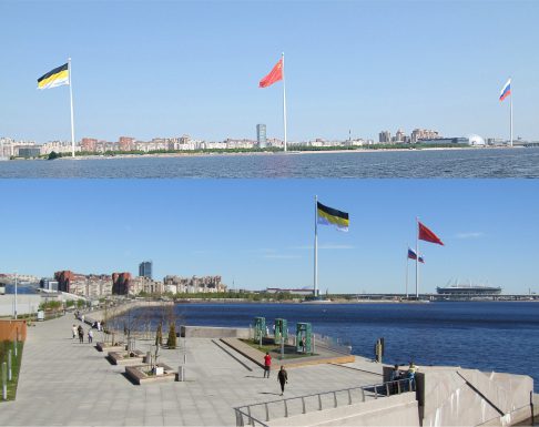 در شهر سن پترزبورگ(سال 2023)، جهت بزرگداشت سیصد سالگی این شهر و نشان دادن همبستگی احزاب، با حضور رئیس جهمور ولادیمیر پوتین، از سه گانه پرچم های سلطنتی قدیم، شوروی سابق و جمهوری روسیه رونمایی شد. اندازه هر کی از این پرچم ها 60 در 40 متر(2400 متر مربع) با وزن 500 کیلوگرم است. لازم به ذکر است طول میله آن ها نیز 175 متر است.